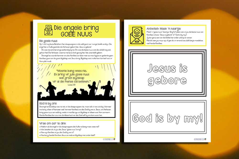 Maak ’n “goeie nuus”-kaartjie. Skryf of teken wat vir jou die beste nuus van Kersfees is (soos “Jesus is gebore!” of “God is by my”).