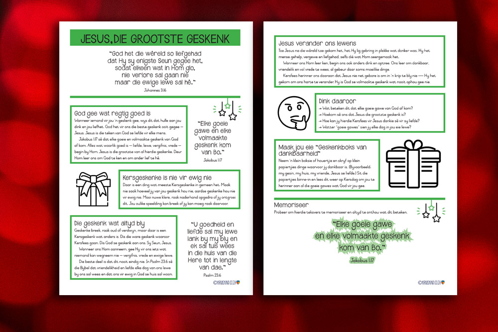 Geskenke breek, raak oud of verdwyn, maar daar is een Kersgeskenk wat anders is. Dis die ware geskenk waaroor Kersfees gaan. Doen hierdie Bybelstudieles saam. Jy kan dit aflaai of hier onder lees.
