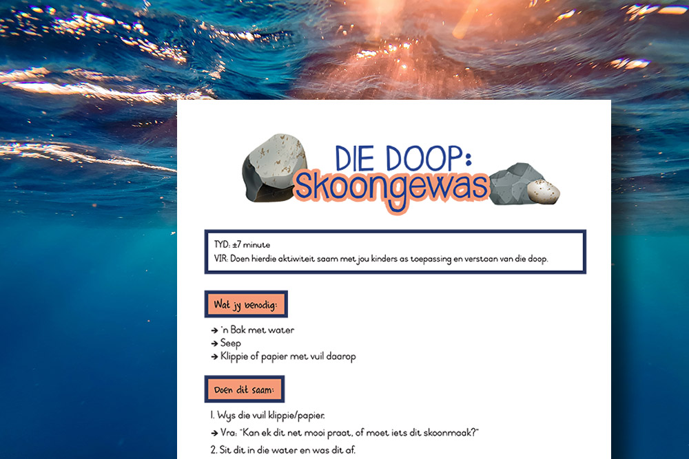 Doen hierdie vinnige aktiwiteit saam met jou kinders om hulle te leer om die doop beter te verstaan nadat julle die Bybelstudie oor wat dit beteken dat jy gedoop is saam gedoen het.