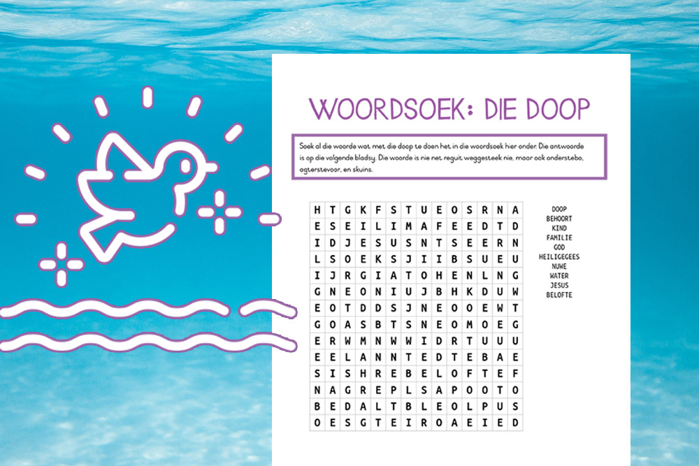 In hierdie woordsoek moet jy woorde soek wat met die doop te doen het. Die woorde is nie net reguit weggesteek nie, maar ook onderstebo, agterstevoor, en skuins. Die antwoorde word op die tweede bladsy gewys.